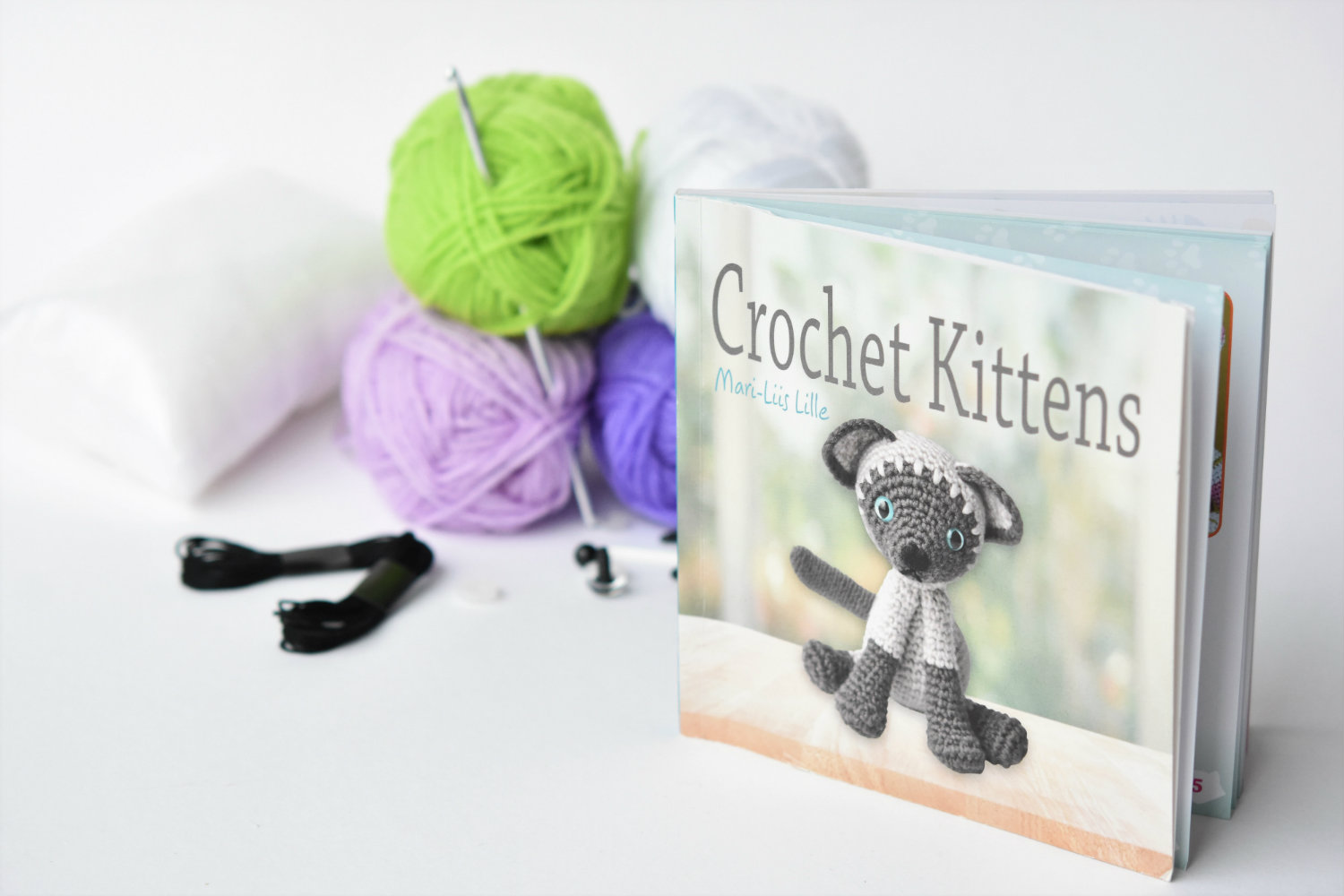 The kit includes materials for making 2 smaller cats – the green one called Tiny Kitten and the purple one named Playful Kitten. There is yarn, crochet hook, stuffing, safety eyes and even thread for stitching the nose.
