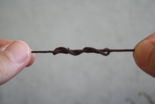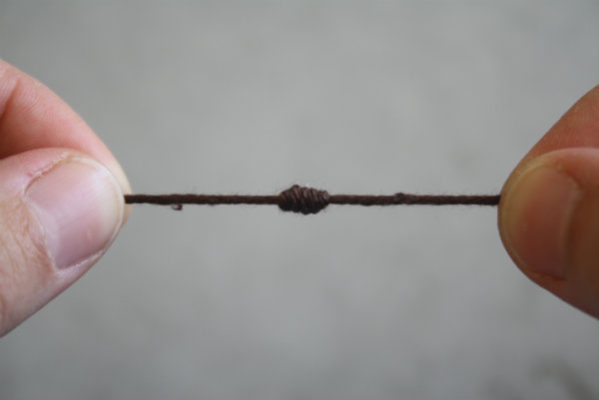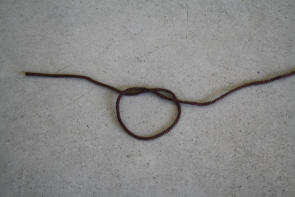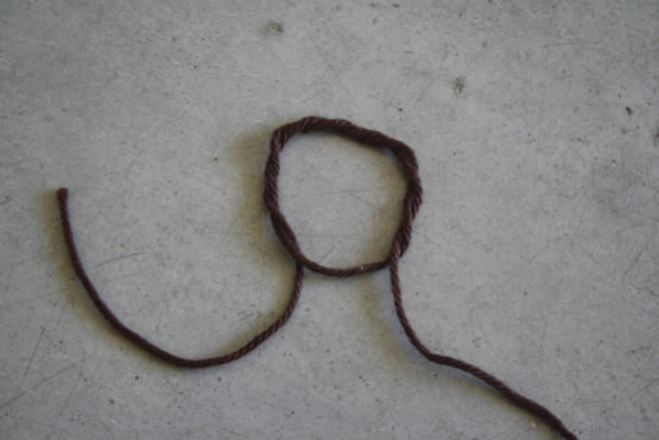 Valmista pirnile ots ja saba. Selleks lõika umbes 50 cm jupp pruunist lõngast. Tee lõngajupi otsa sõlm, kuid ära seda kinni tõmba, vaid jäta lõdvaks. Keera mõlemat lõngaotsa veel paar keerdu ümber moodustunud ringi. Seejärel haara mõlemast lõngaotsast ja tõmba nii, et moodustuks sõlmetombuke.