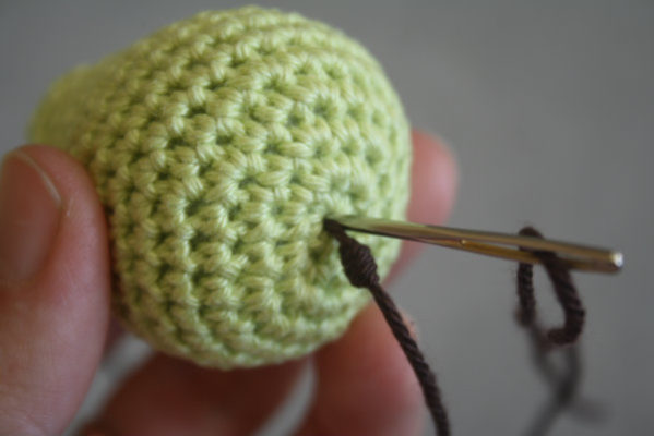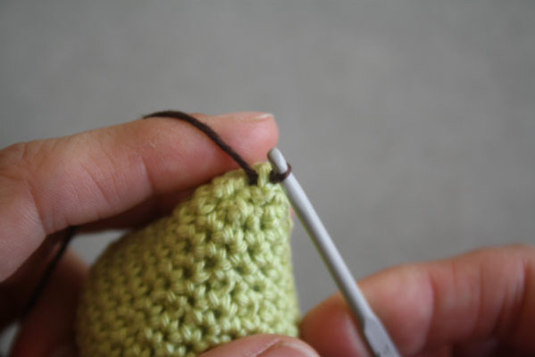 Aja sukanõela abiga lühem lõngasaba pirni jämedamast otsast sisse, kinnita avade vahelt sõlmega ja peida väljarippuv lõngaots. Pikem lõngasaba aja samuti otsaaugust sisse ja vii otse läbi pirni peenemast otsast välja. Hoides pirni õiget pidi käes, otsi peenemas otsas üks silmuste ava ja pista heegelnõel läbi. Võta pruun lõng nõelale ja too läbi silmuse.
