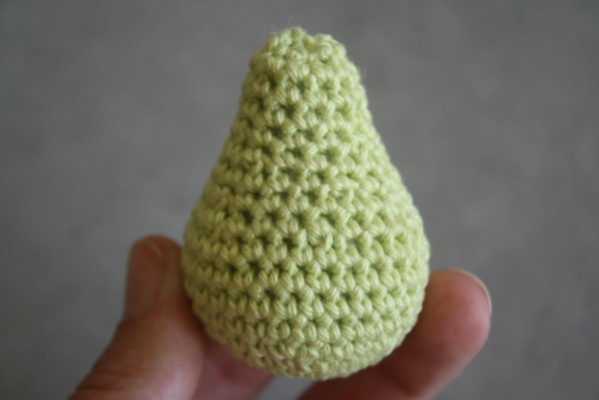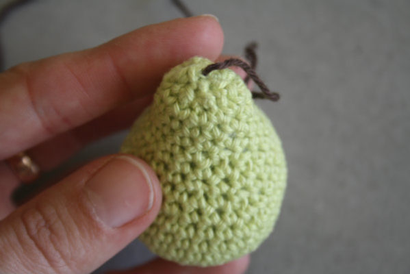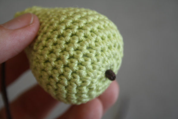 Väikest heegeldatud pirnikest võib kasutada võtmehoidjana või ripatsina koti küljes. Haaknõela abiga saab sellest hoopis vahva suvise prossi.