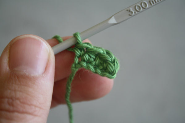 Lehe jaoks tee tumedama rohelisega 5 ah, 1 ks heegelnõelast teise ah-sse, poolsammas kahte järgmisse ah-sse, 1 ks viimasesse ah-sse. Tee 1 ah ja jätka ahelsilmuste keti teisel poolel. 1 ks samasse silmusesse, poolsammas kahte järgmisse ah-sse, 1 ks viimasesse ah-sse. Lõpetuseks aassilmus esimesse ks-sse.