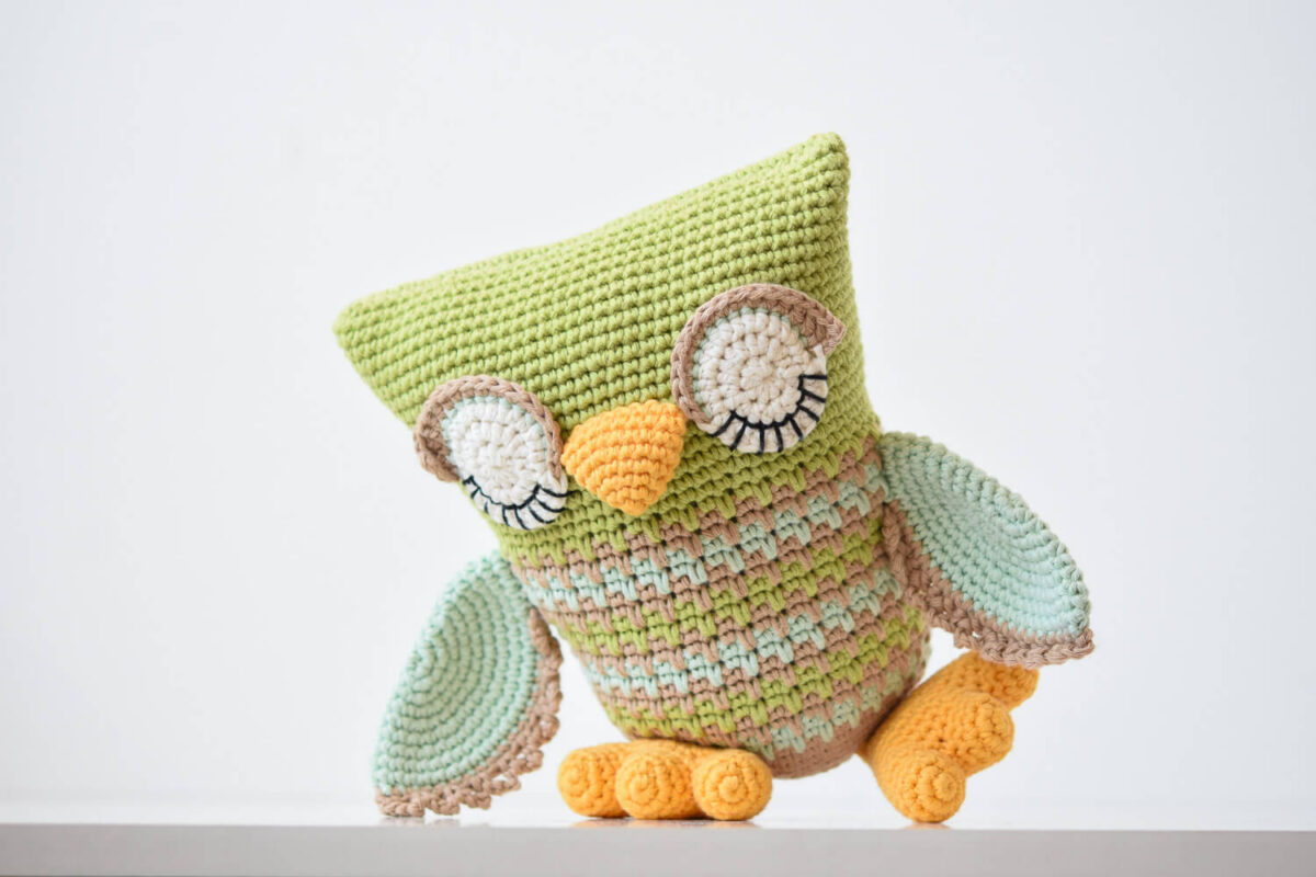 See öökull on pigem suuremat sorti kaisukas – umbes 27 cm – ja heegeldatud jämedamast puuvillasest lõngast, mis teeb temast mõnusalt pehme, natuke padjasarnase tegelase. Õpetuses kasutan viite värvi lõnga, aga tegelikult annab muster vabalt mänguruumi ka lõngajääkide ära kasutamiseks.