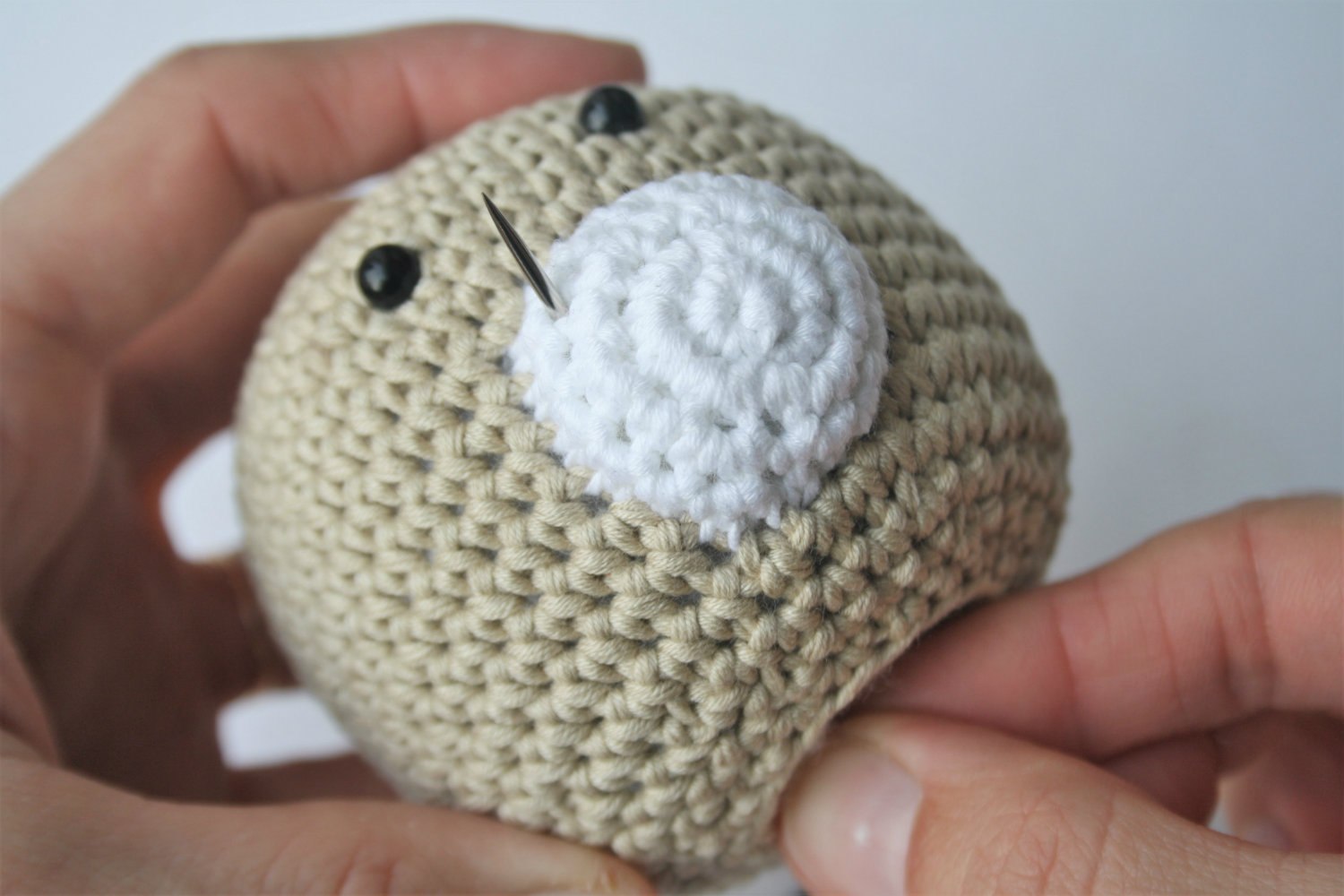4. Kergita nina pisut sõrmeotsaga ja samal ajal too nõel välja täpselt nina keskkohast. Tee seda kõike üliettevaatlikult, et juba tehtud pisteid mitte rikkuda!