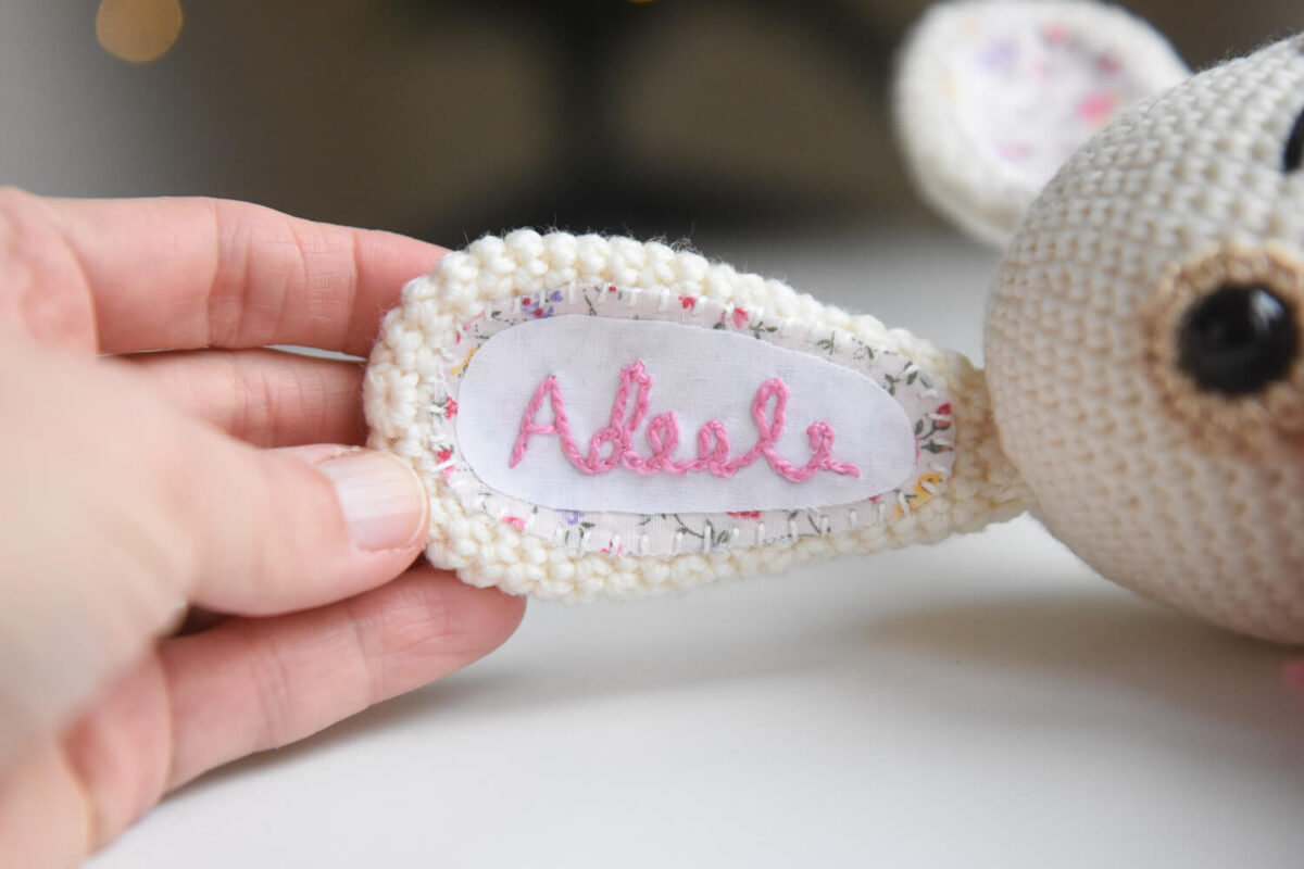 Siin on üks armas nimega heegeldatud kaisujänes Adeelele. Valmistatud pehmest meriinovillast, seljas äravõetav puuvillane kleit. Jänku kõrvale on käsitsi tikitud lapse nimi.