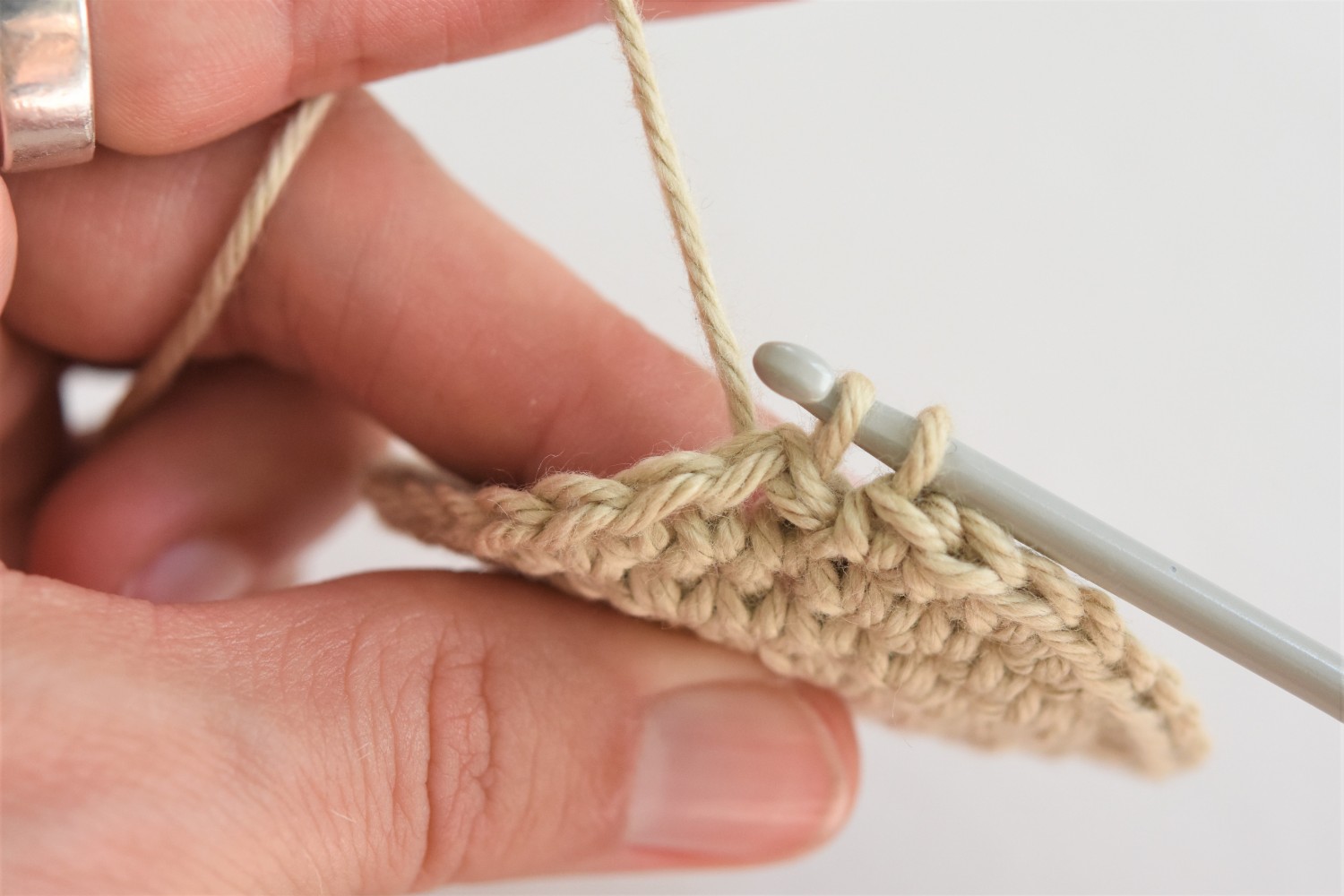 2. Pista heegelnõel silmuse tüve eest läbi ning too välja töö tagaküljel, silmuse tüvest vasakult (käesoleva ja järgmise silmuse vahelt).