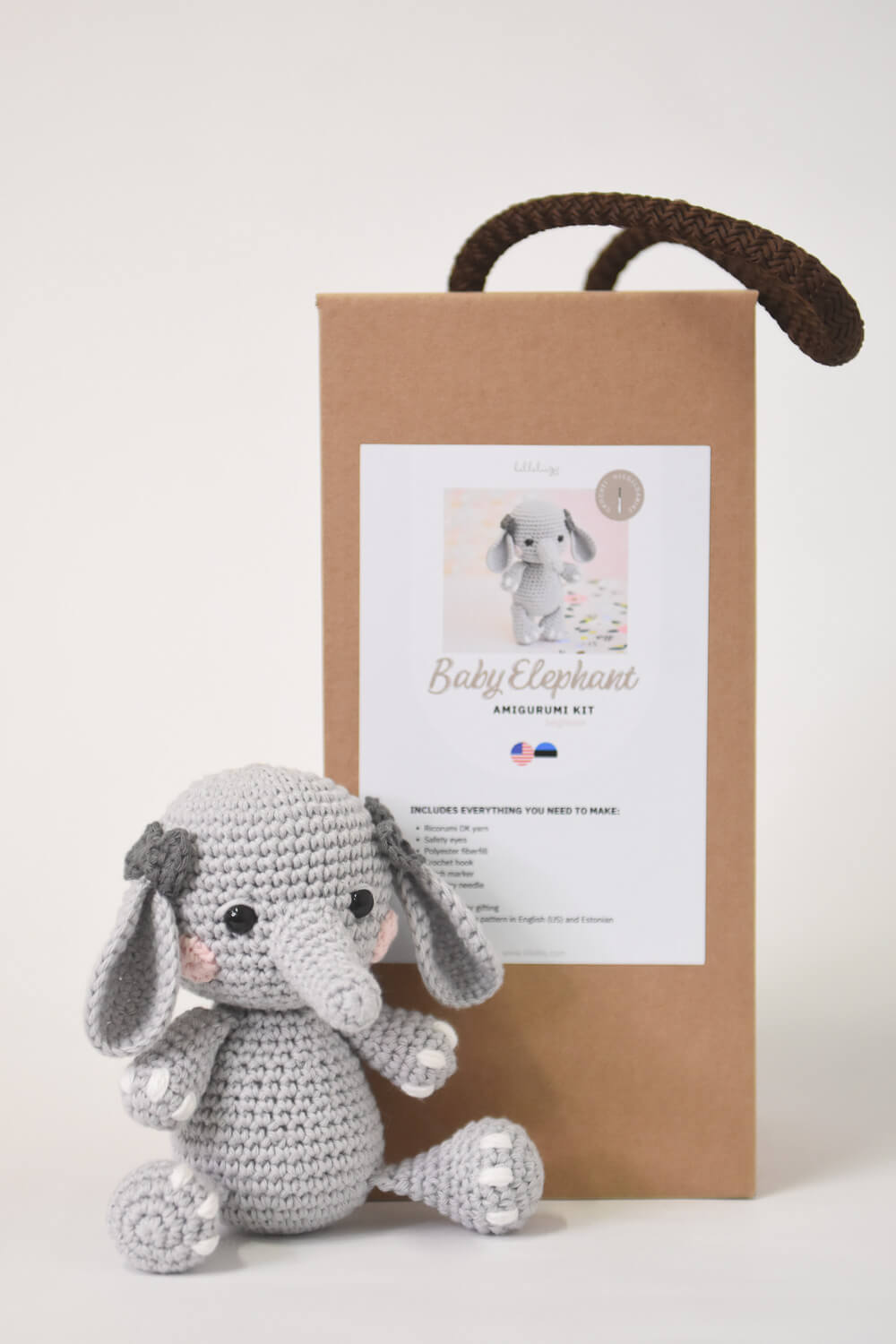 Amigurumi elevandi heegeldamise komplekt, mis sisaldab kõike, mida vajad selle armsa mänguasja heegeldamiseks.