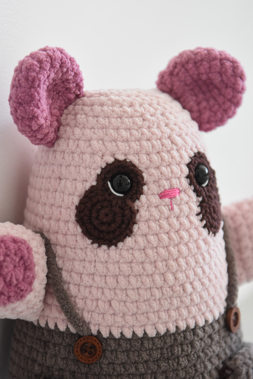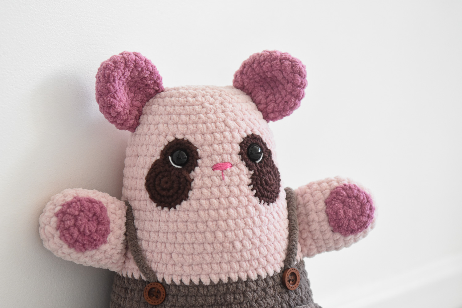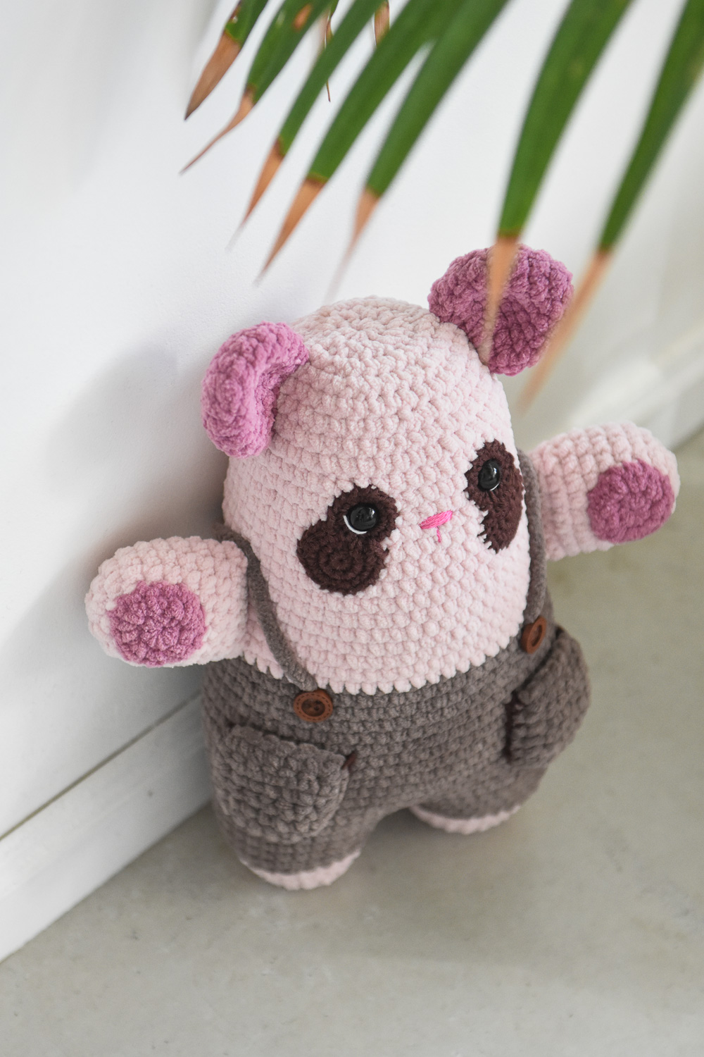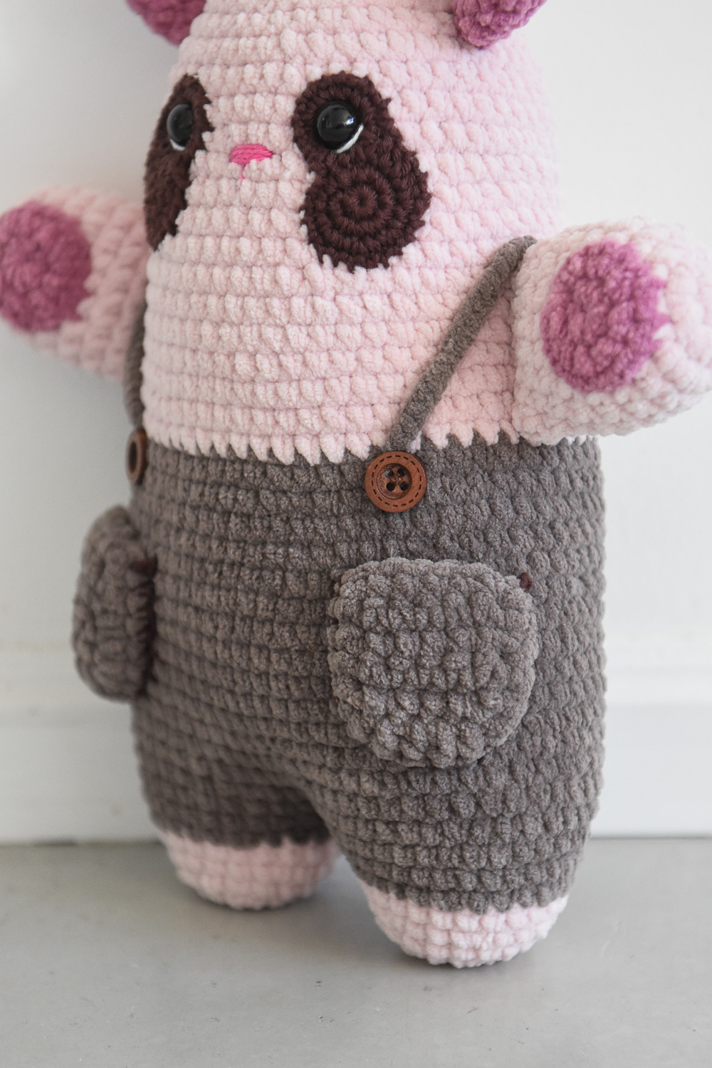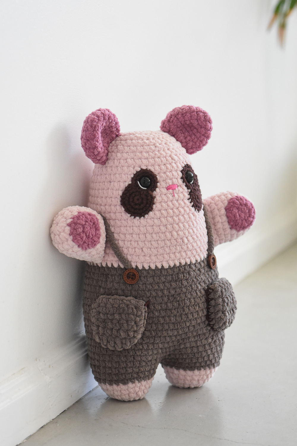Suur, pontsakas ja pehme pandakaru. Heegeldatud roosades ja pruunides toonides. Panda on valmistatud imepehmest ja sametisest šenill-lõngast. Karul on suured ilmekad silmad, vahvad käpalaigud, toredad taskutega püksid ja palju muid detaile, mida avastada.