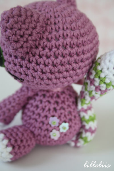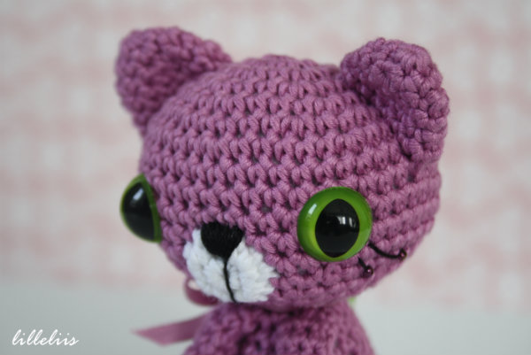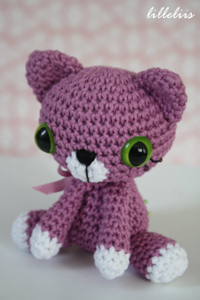 Ka lõnga eelistused on aja jooksul muutunud. Olen valivam ja hindan kõrgelt materjali naturaalsust. Nii sai ka see kassike esialgse poolvillase asemel seekord hoopis puuvilla ja bambuse segust. Silmad said kaunistuseks helmestega ehitud ripsmed, kiisukese küljele õmblesin litritest ja helmest “tätoveeringu”.