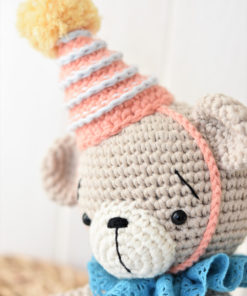 The baby bear is wearing a pompom party hat and lovely ruffled collar. He is here to celebrate and that`s why he brought a delicious cake with him.
