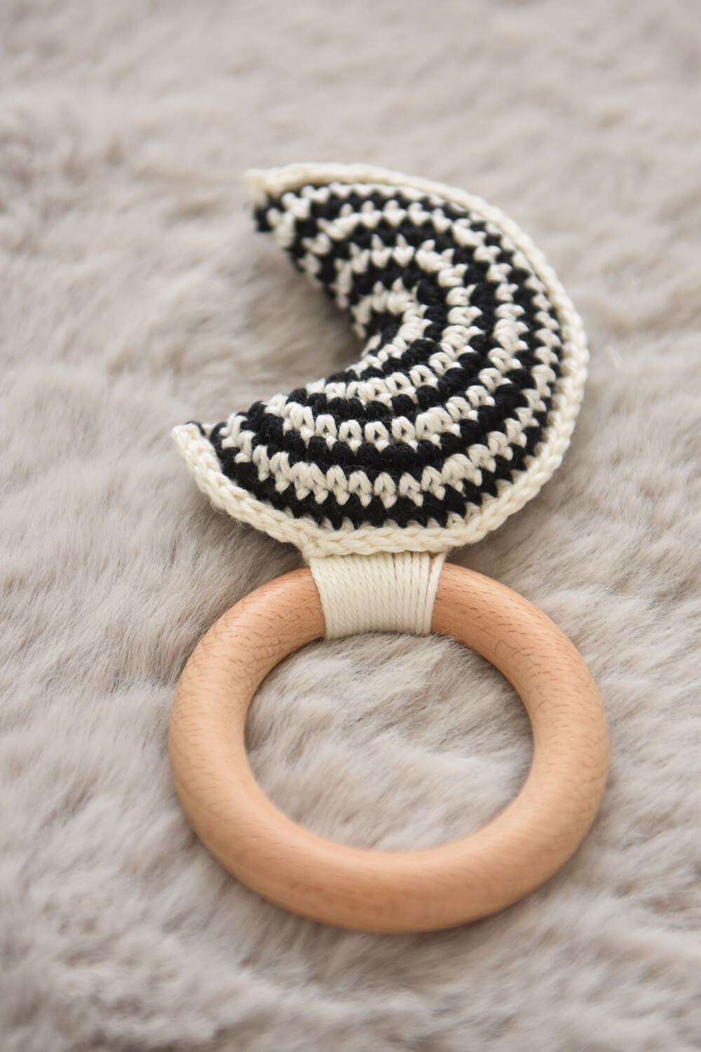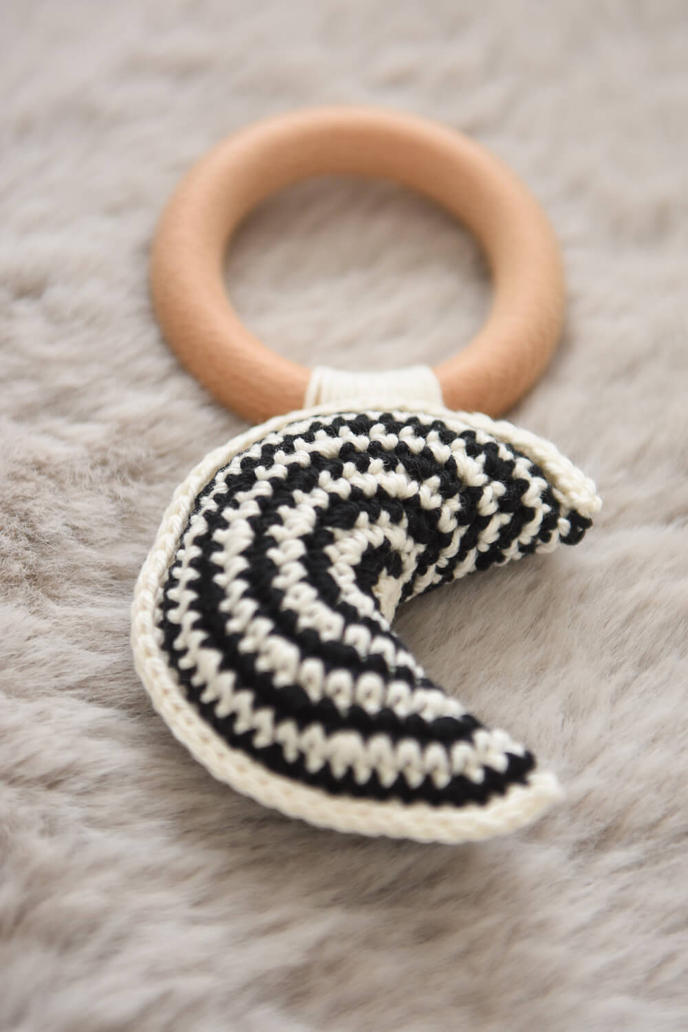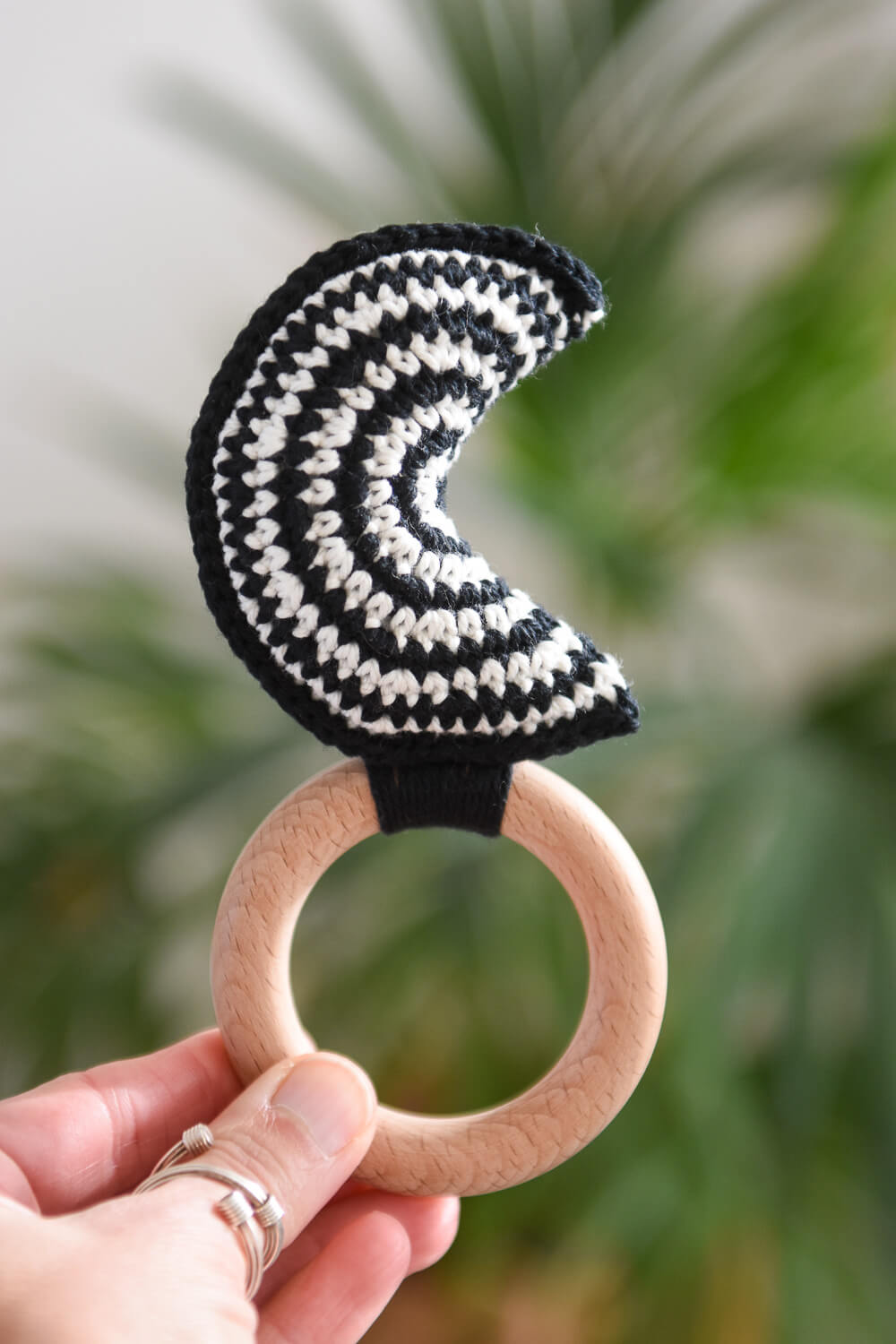Crocheted Montessori Moon Rattle is a beautiful and conscious gift for a baby.