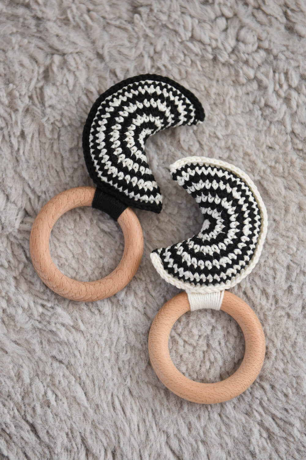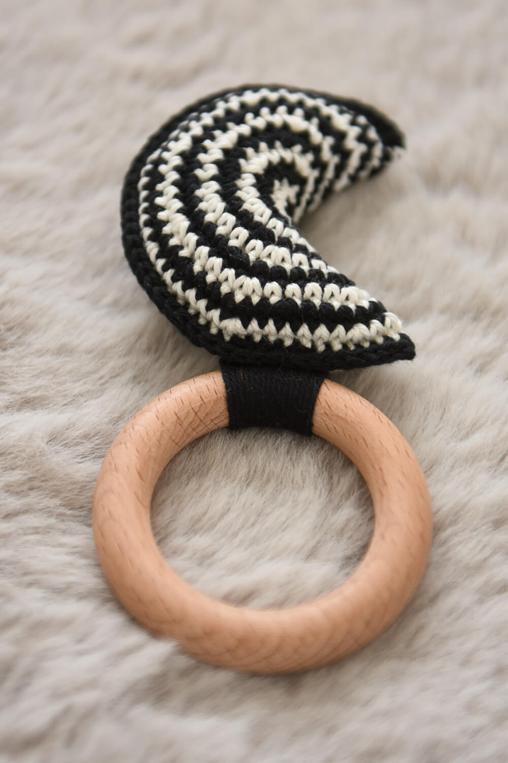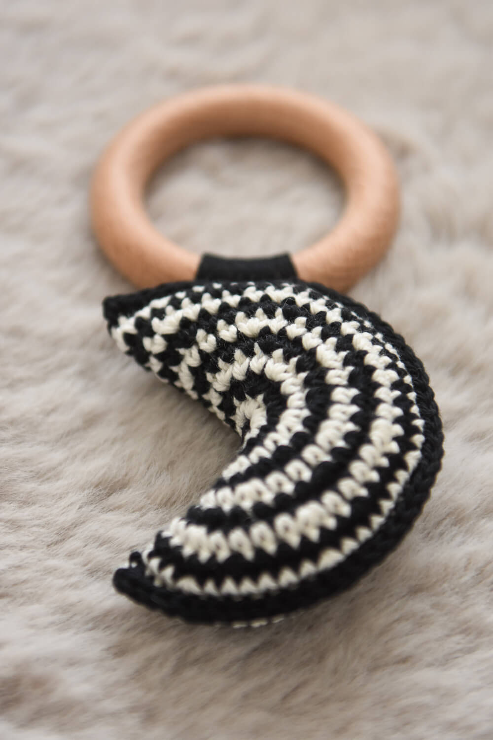 Crocheted Montessori Moon Rattle is a beautiful and conscious gift for a baby.
