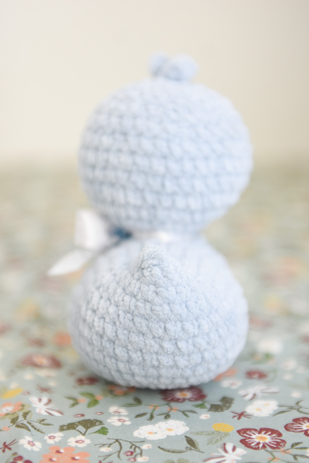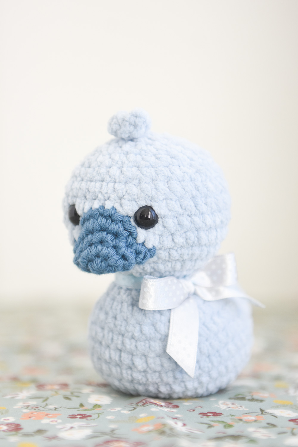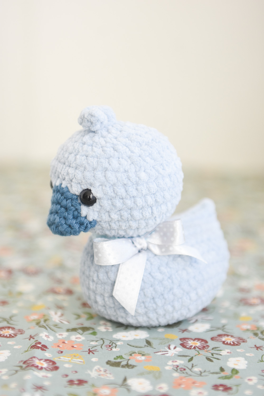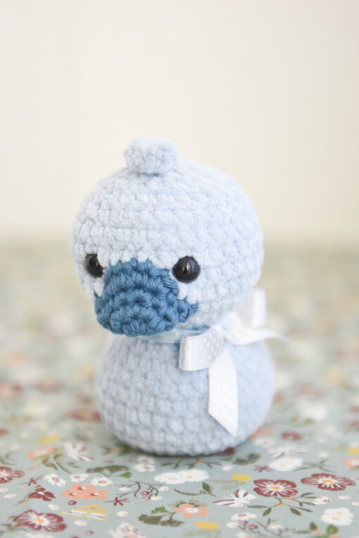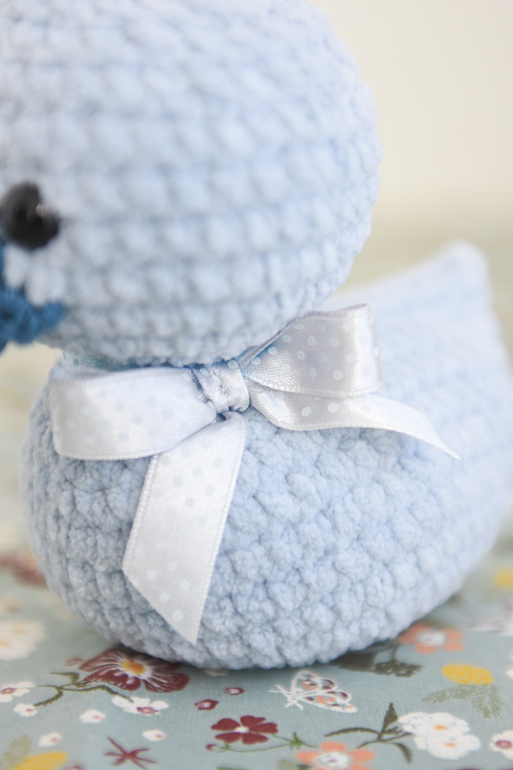 A soft and cuddly duck toy for children. The little plush duck is crocheted from velvety soft chenille yarn. It has a cute beak and a beautiful polka dot bow tied around its neck.