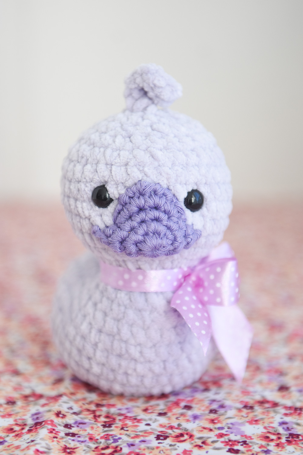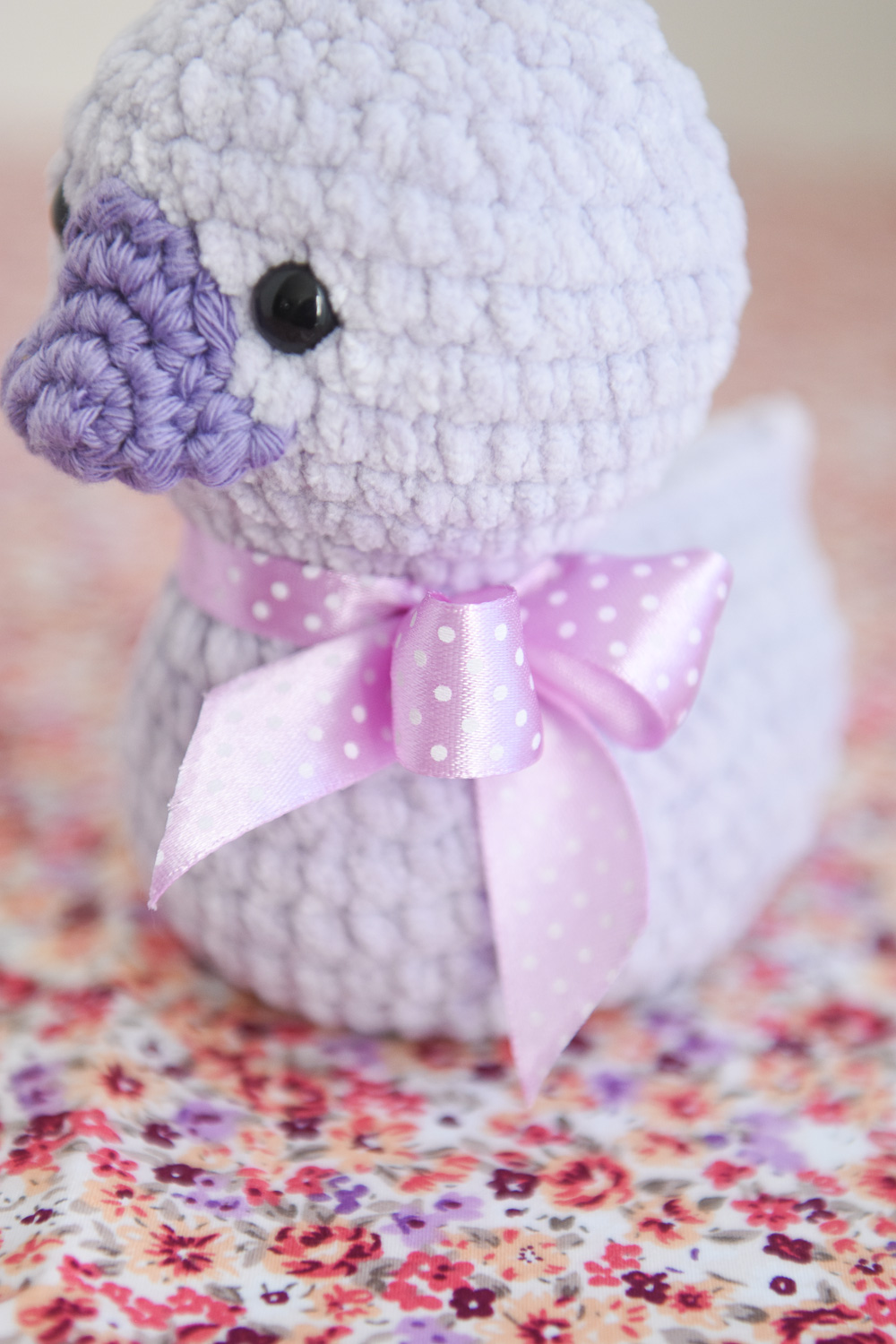 A soft and cuddly duck toy for children. The little plush duck is crocheted from velvety soft chenille yarn. It has a cute beak and a beautiful polka dot bow tied around its neck.
